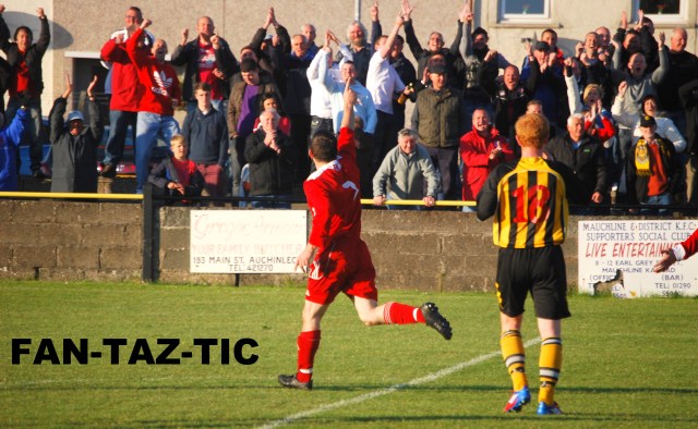 With quarter an hour to go Menzies and Dempster left to rapturous applause to be replaced by the fresh legs of Craig McEwan and Bobby Colligan …. and what fresh legs for ten seconds later Colligan exploded from a standing start to beat Michael Daley to the ball and burst into the box. Although the defender recovered to block the direct path to goal Colligan kept his cool to square the ball across the face of goal where it was missed by defender Findlay and the incoming Cochrane but fell perfectly for John Paul Boyle who took a touch on the six yard line before rifling the ball into the roof of the net, just reward for another menacing performance.