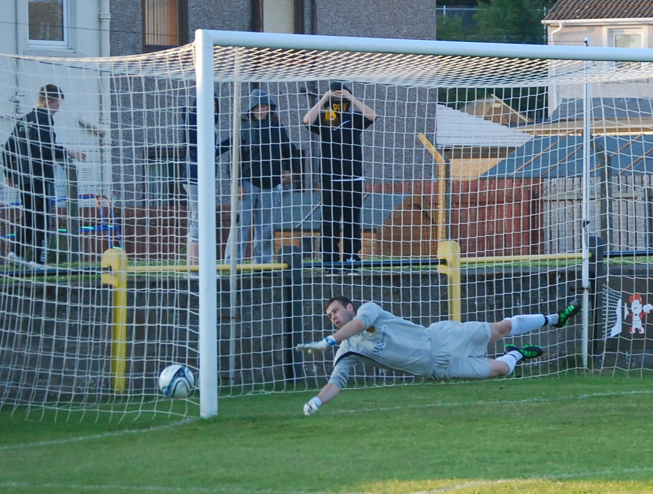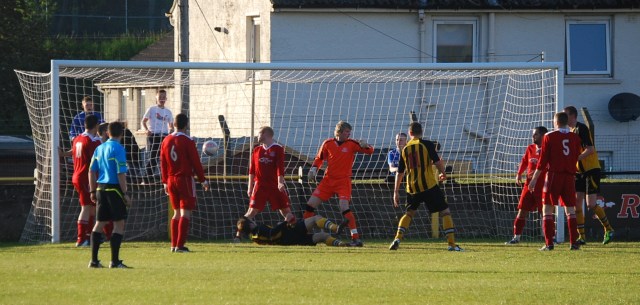 On 14 minutes the home side won the first corner of the match but keeper Ally Semple was the match of McKenzie punching the ball clear of the striker’s head. Soon after Gareth Armstrong sprung high above Darren Ferguson and his header from 12 yards out forced Craig Brown to dive low to push the ball round the post – the keeper then safely clutching the resultant corner. A minute later a long ball released McKenzie upfield and he has raced into the box Semple simultaneously rushed from his line, only for the back-tracking Ryan McChesney to rob the striker of the ball with a perfectly timed tackle. Six minutes later Craig Menzies lofted the ball over the heads of the Shotts back line into the box for Armstrong to chase but Brown raced from his line to bravely bundle the ball to safety.
