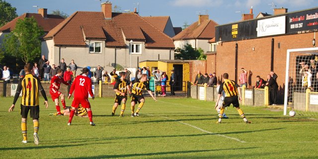 As is often the case in a game of such magnitude it struggled to rise to the occasion and the first half proved to be a tense nervy affair. With a stiff breeze at their back the visitors were first to threaten when on 9 minutes John Dempster, deep in the six yard box, tried to guide home a Richie McKillen free-kick only for the ball to spin over the bar. Two minutes later the home side responded through Graham McLaren who after shaking off defender Ryan McChesney broke into the box and drilled a low shot from 10 yards out only for keeper Ally Semple to block at his near post and then push the loose ball from the feet of the incoming Joe Barclay, allowing McChesney to clear the danger.