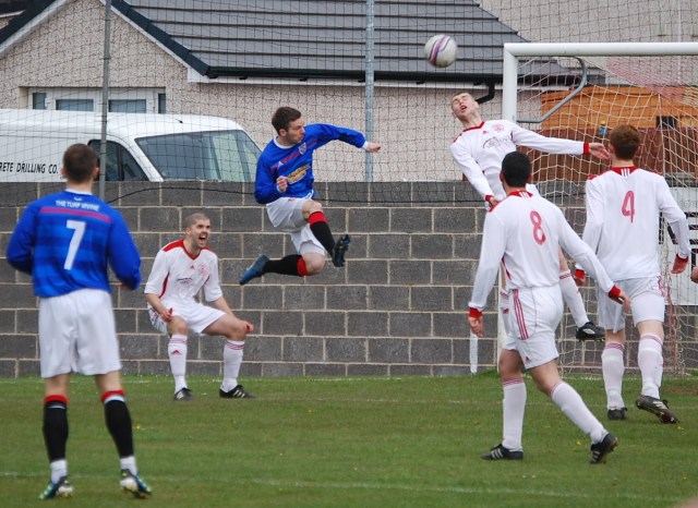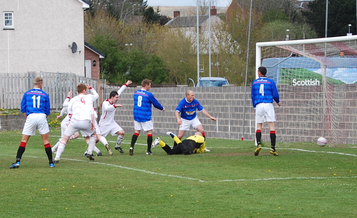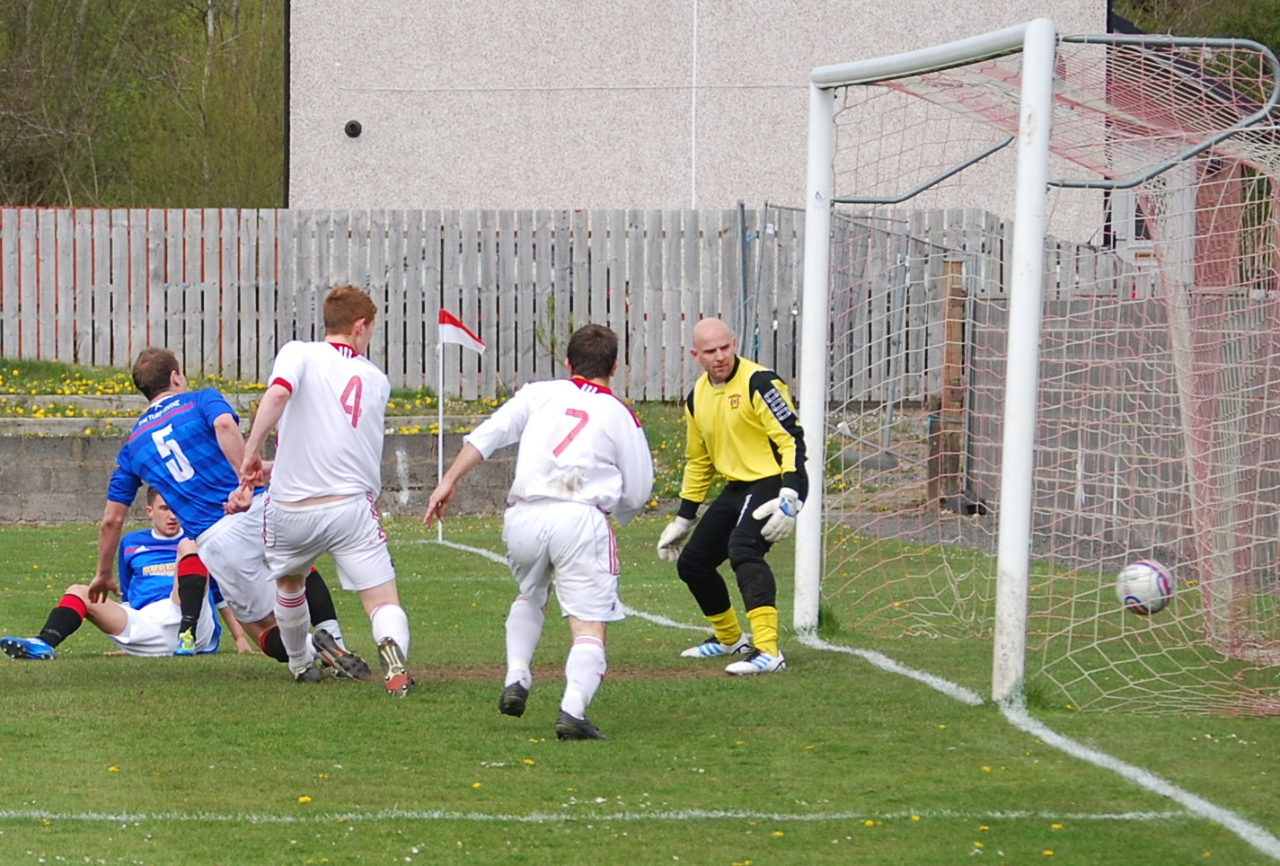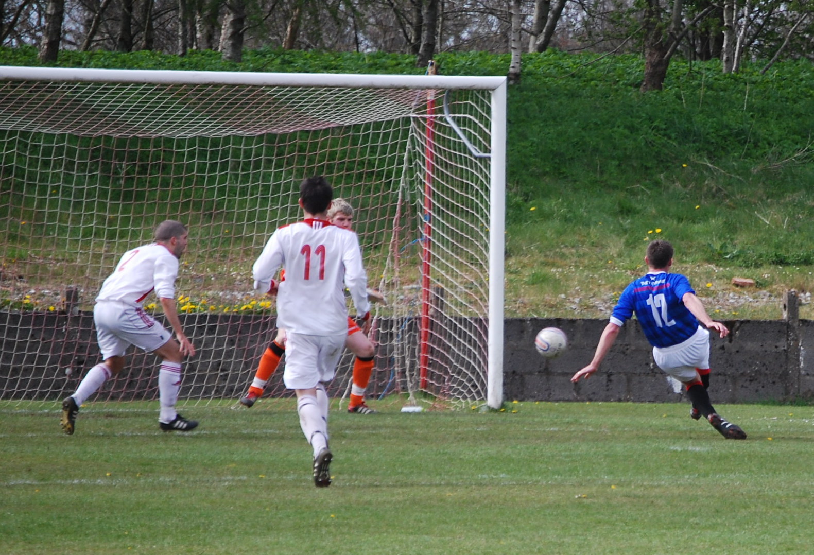 Four minutes later a Craig Menzies throw-in was gathered by Boyle and flicked back to McEwan who lobbed it into the box for Gareth Campbell who was bundled to the ground by McLennan and while the Glens’ man claimed in vain for the spot kick Craig Potter gathered the loose ball and slammed it home from the outskirts of the box; the celebrations enhanced in recognition of his first goal for the club.
